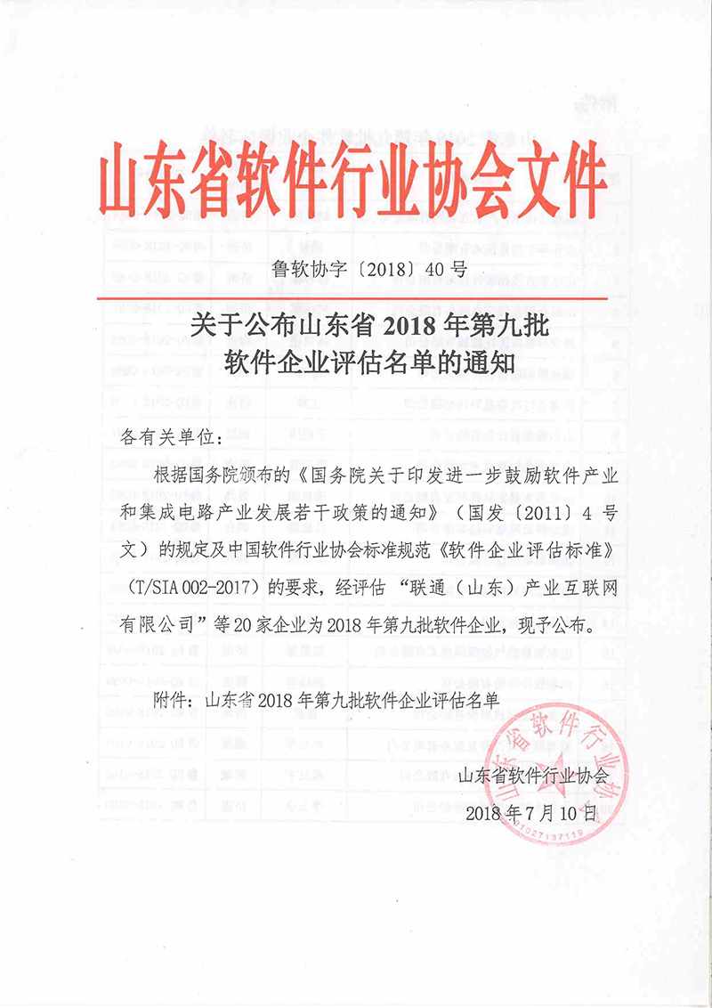 近期,根据国务院颁布的《国务院关于印发进一步鼓励软件产业和集成电路产业发展若干政策的通知》的规定及中国软件行业协会标准规范《软件企业评估标准》的要求,经过山东省软件协会的严格审查,开云手机平台通过了软件企业认定的严格评审程序,被授予山东省2018年第九批软件企业。